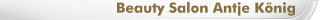 | Inhaberin Frisörmeisterin Antje König Tel. 03445 - 77 17 97 Fax 03445 - 71 14 86 e-Mail info@beautysalon-koenig.de | |  | | Öffnungszeiten: Montag geschlossen Dienstag 8:00 bis 18:00 Uhr Mittwoch 8:00 bis 18:00 Uhr Donnerstag 8:00 bis 18:00 Uhr Freitag 8:00 bis 18:00 Uhr Samstag 7:oo bis 11:00 Uhr und nach Vereinbarung |  | |
